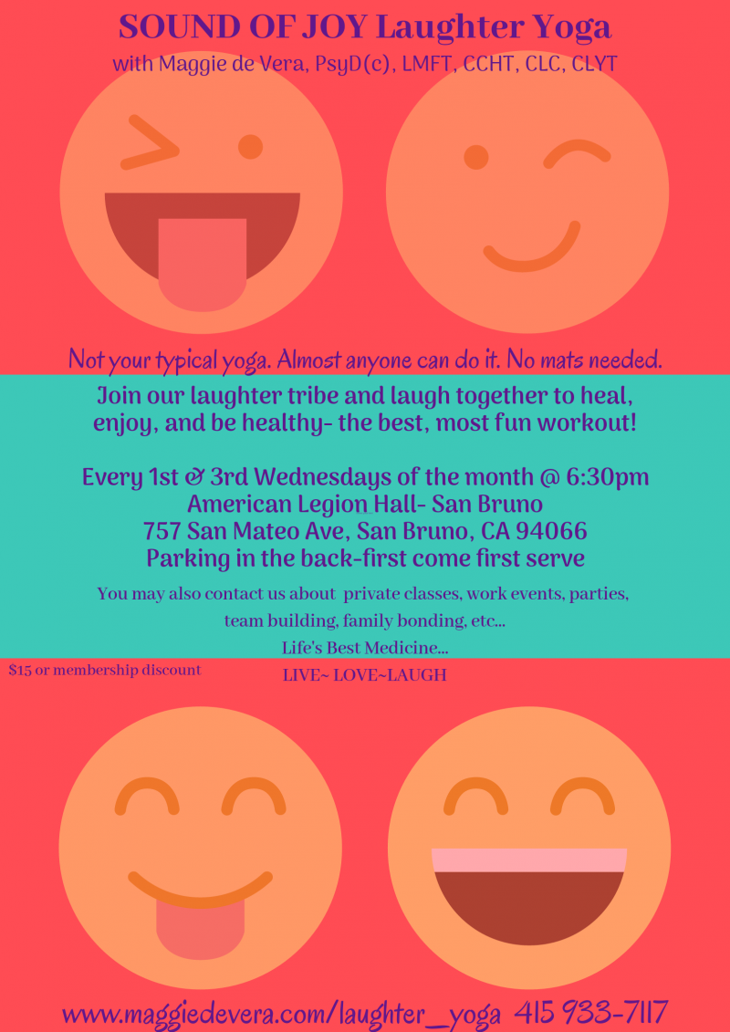 Aside from Maggie's other healing/therapeutic approaches, Maggie is also a certified Laughter Yoga Teacher/Therapist and is excited to spread laughter and joy as a means of healing. Clinical studies have researched and validated the numerous medical/physical and mental health benefits from laughter. Laughter yoga incorporates the elements of deep breathing and sustained laughter, among others- that lead to significant health benefits. YOU CAN EVEN FAKE THE LAUGHTER and it'll still be just as beneficial! But the laughter, energy, connection with others, and breathing can create an incredible "high" that makes this type of yoga exercise a wonderful experience.